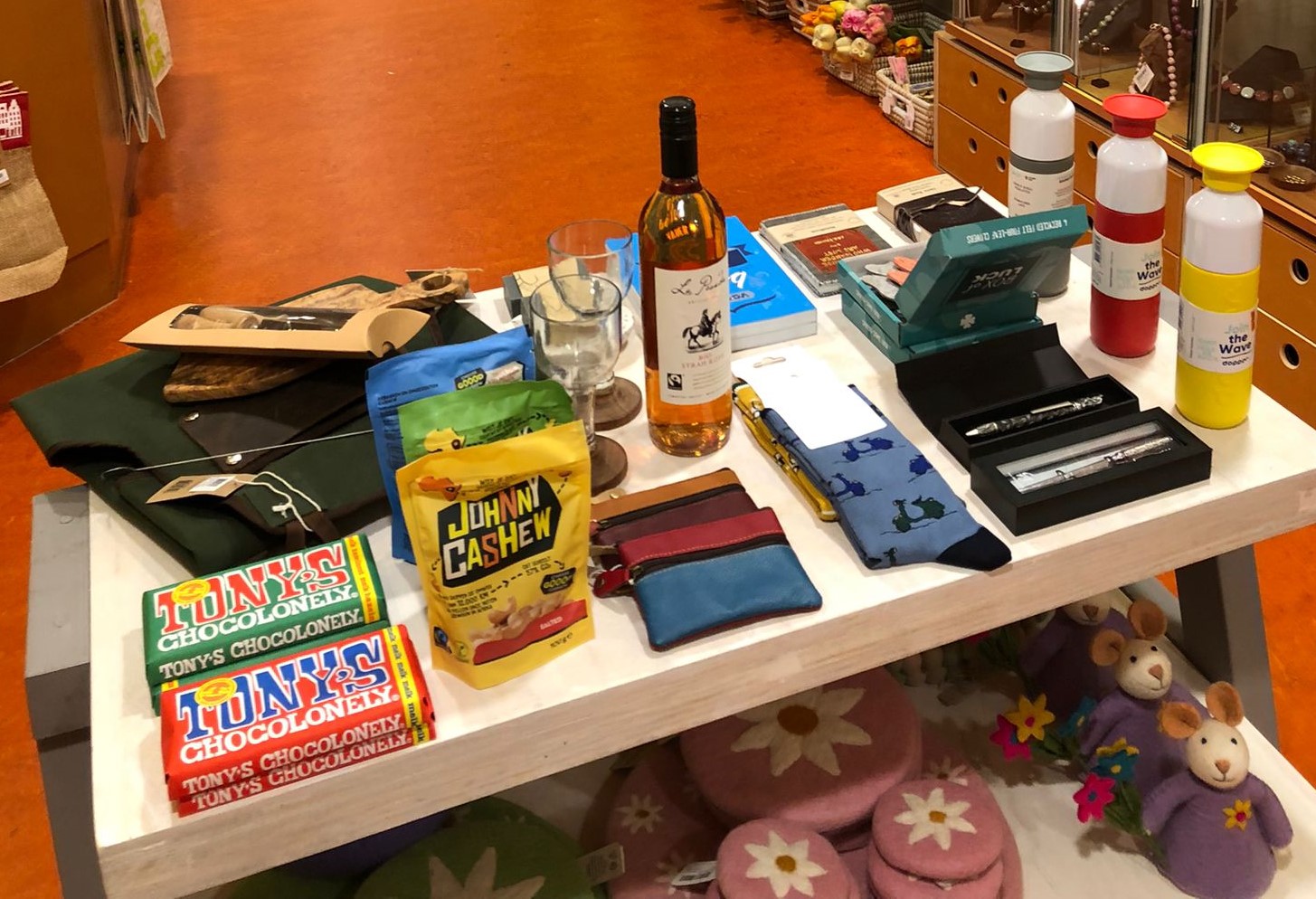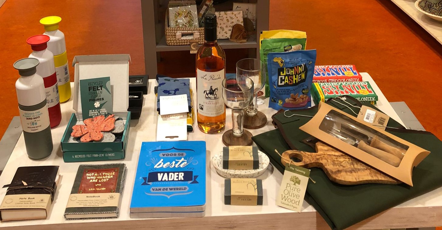 Doppers, duurzame lunchbags, heerlijke Tony Chocolonely en Johnny Cashew nootjes, sokken van LetsDoGood's, zeep en olijfhoten zeepbakjes, BBQ schort, notitieboekjes en pennenset, pasjesbeurzen van restleer en een boek voor de beste Vader :-).