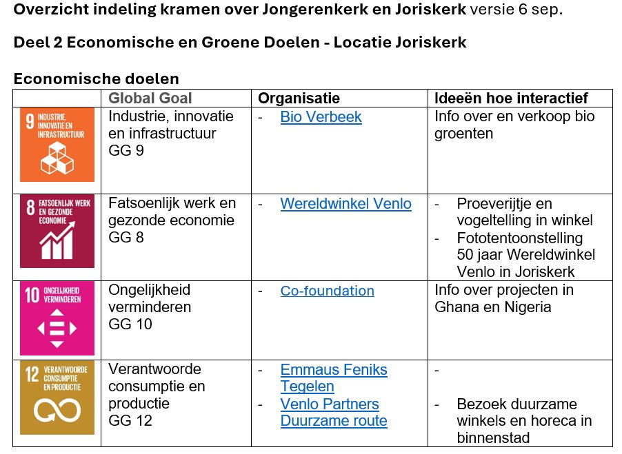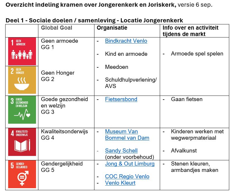 Jongerenkerk Venlo en Wereldwinkel Venlo zijn al respectievelijk 60 en 50 jaar actief in de Venlose binnenstad. Op zondag 22 september vieren we dat met een Global Goal Markt Evenement in en rondom Wereldwinkel, Joriskerk en Jongerenkerk. Global Goals zijn de 17 ontwikkelingsdoelen van de Verenigde Naties voor de hele wereld en alle mensen op economisch, sociaal en groen gebied. Daaraan leveren beide organisaties al hun hele bestaan een bijdrage en doen dit graag lokaal samen met andere organisaties.