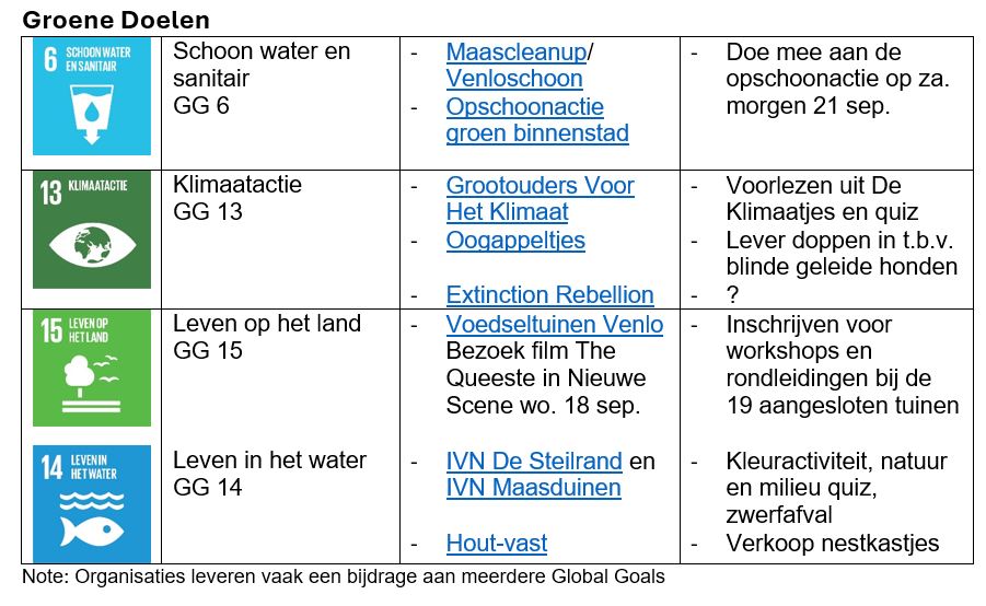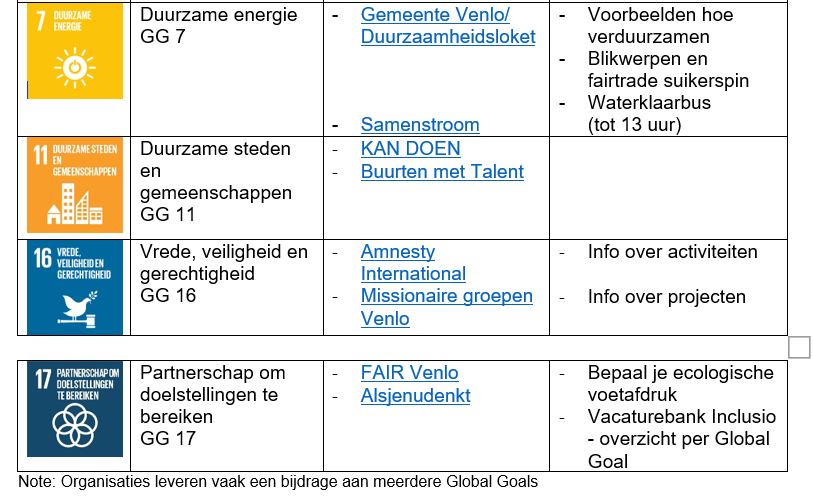 Zo’n 35 Venlose organisaties betrekken jong en oud op de markt bij het werken aan een betere wereld. Gezellig en leuk om mee te maken. Zo is er een quiz en kleuractiviteit bij het IVN, lezen Grootouders Voor Het Klimaat voor, presenteert de gemeente voorbeelden hoe je woning te verduurzamen, leer je bij Voedseltuinen hoe je je eigen voedsel kunt verbouwen en kun je kennis maken met Jannie en haar (blinden)geleidehond Lion.