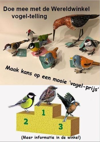 in het weekend (30 januari t/m 1 februari) vindt de De Nationale Tuinvogeltelling 2026 plaats, een intitatief van de Vogelbescherming. Misschien doen jullie thuis ook mee. Dan heb je al kunnen oefenen. Wereldwinkel Venlo heeft namelijk in de week van 1 t/m 8 februari haar eigen versie voor een vogeltelling in onze winkel. Formulieren zijn verkrijgbaar bij de balie.