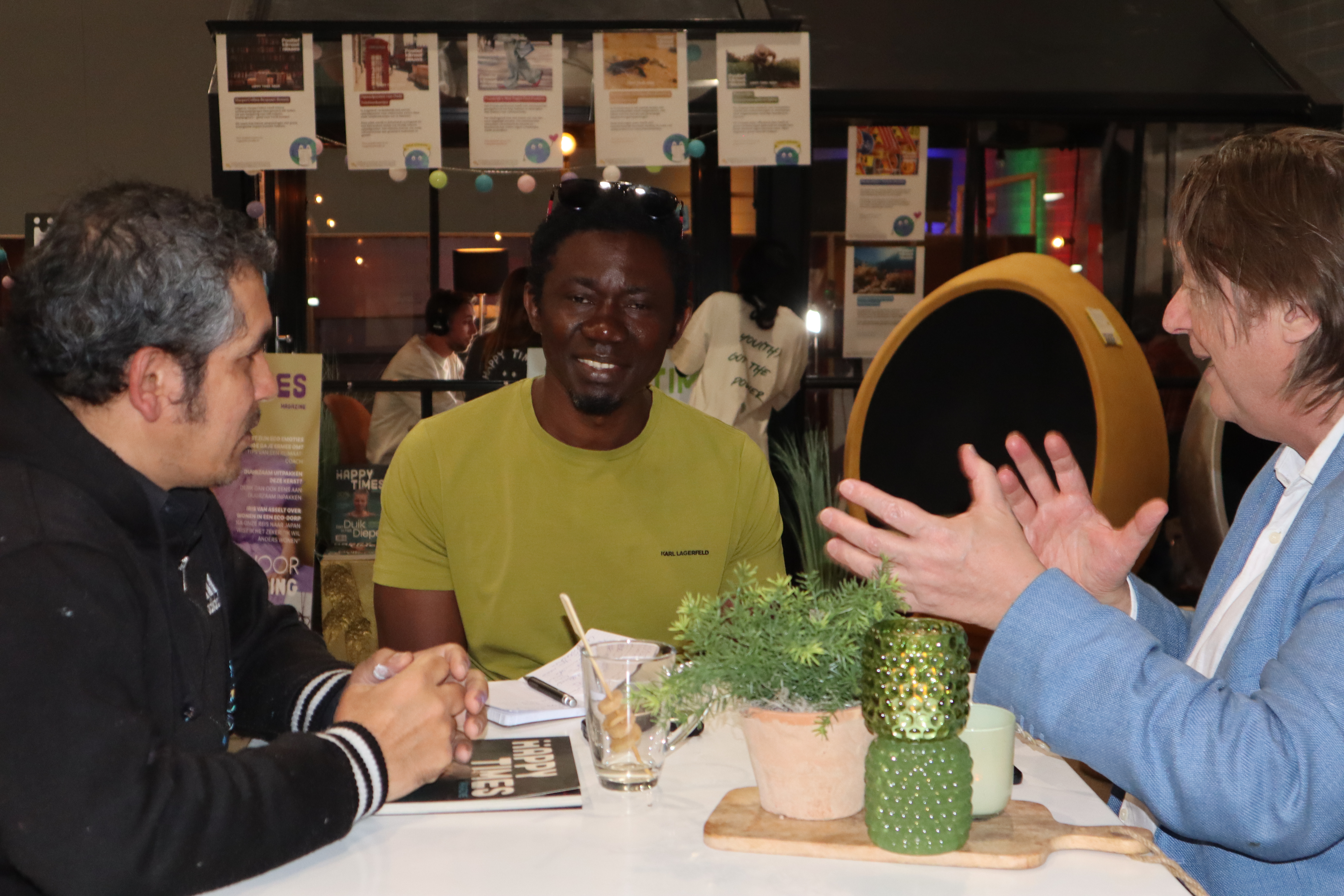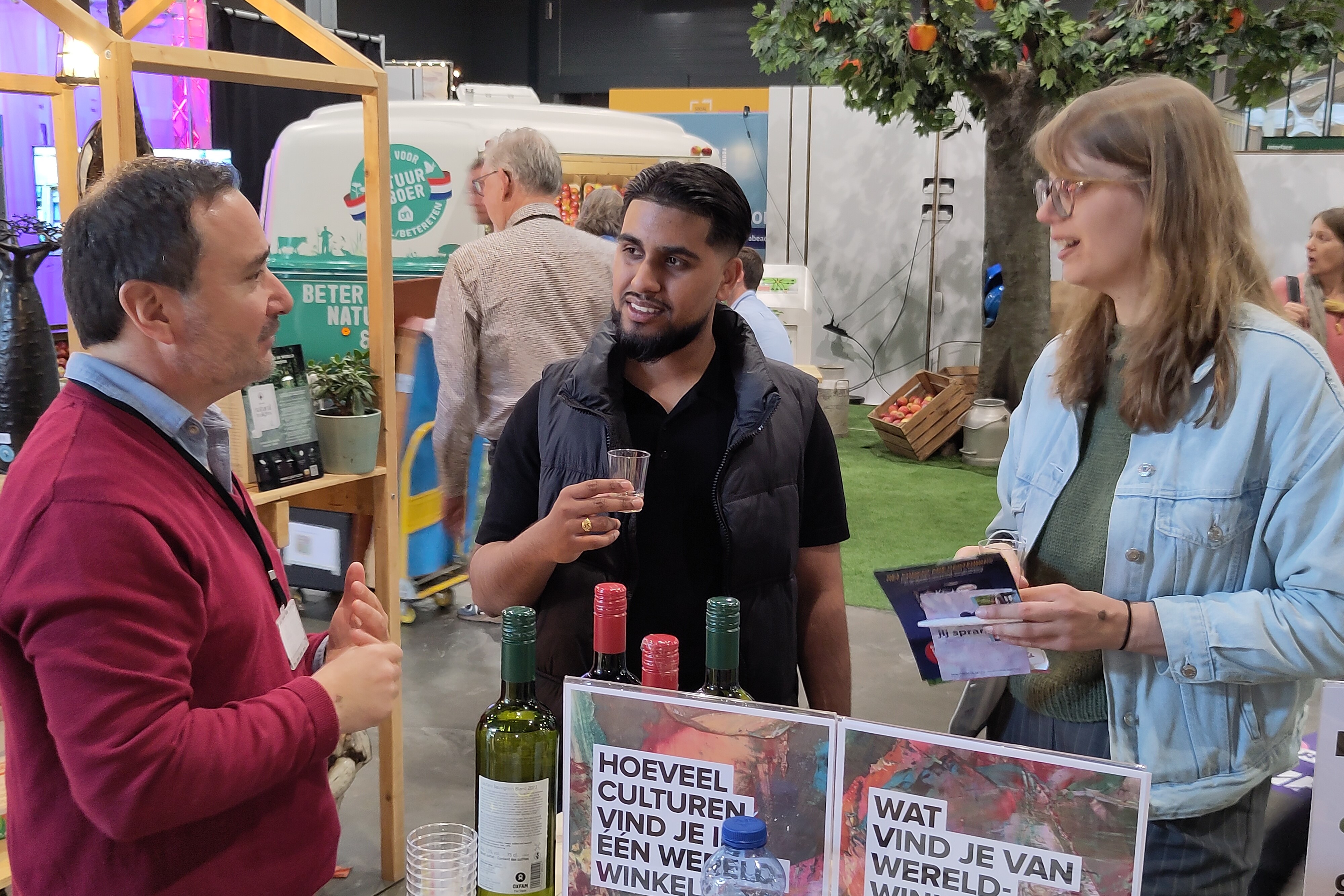 In de dialoog hoek van de stand proeven bezoekers van fairtrade producten: chocolade van Chocolatemakers, Cashewnootjes van Johnny Cashew en biologische Lautaro wijnen uit Chili. Uitleg bij de wijn geeft Victor(links), de voormalige directeur en nu ambassadeur voor de producerende wijn coöperatie. Ter inspiratie voor organisaties zijn voorbeelden van Kerst/geschenkpakketten te zien, evenals een prachtige gedekte tafel met o.a. Tunesisch aardewerk en olijfhouten producten. Op een beeldscherm vertellen ook video's in beeld en geluid de verhalen van producenten.