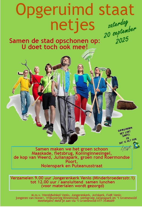Onder het motto “Opgeruimd staat netjes” maken de Jongerenkerk, Joriskerk, Fair Venlo, jongeren van Home+, Wijkoverleg Binnenstad, werkgroep Julianapark, ‘t Groenewold en de Wereldwinkel groen in de binnenstad schoon. We doen dat langs de Maaskade en de kop van de Weerd, de Koninginnesingel, rond de Roemondse poort, in het Nolenspark en de Puteanusstraat.
